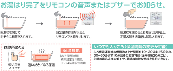 自動お湯はりまたは保温運転後20分または設定時間毎に湯温を自動的にチェックし、設定温度まで沸き上げます。