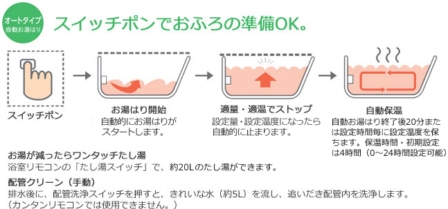 リモコンのスイッチを押すだけでお湯はりから保温までおまかせ、お湯の量が減ったら、リモコンのスイッチを押せばたし湯をします。