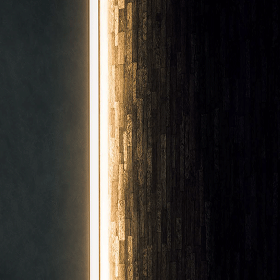 壁に埋め込まれた圧迫感のない照明で、縦に伸びる光が、空間に奥行きと広がりを与えます。