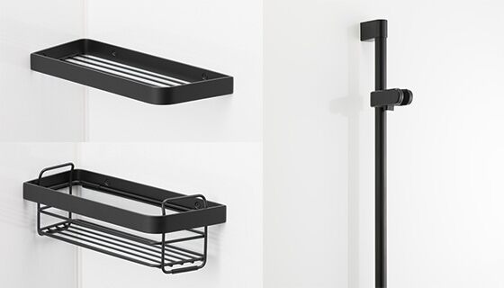 メタルバスケットや握りバーには、浴室空間を引き締めるブラックアイテムをラインアップ。