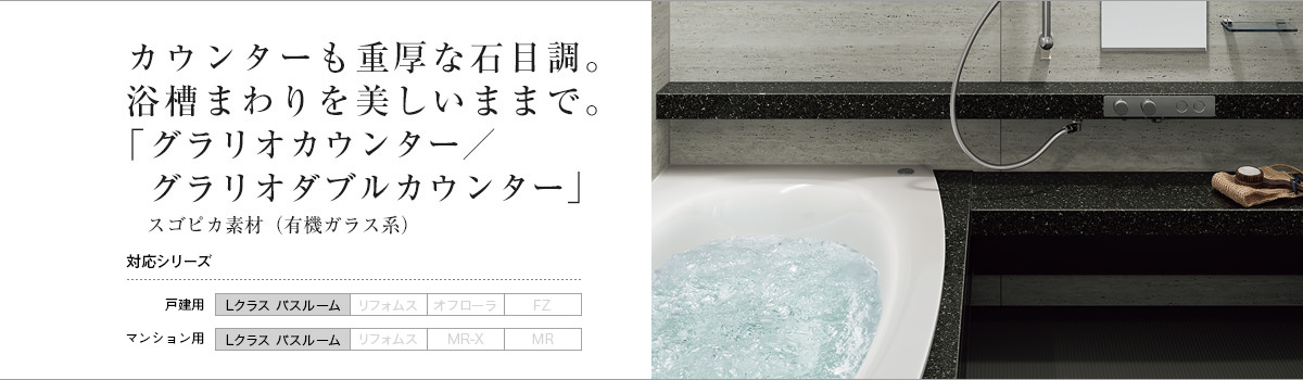カウンターも重厚な石目調浴槽まわりを美しいままで