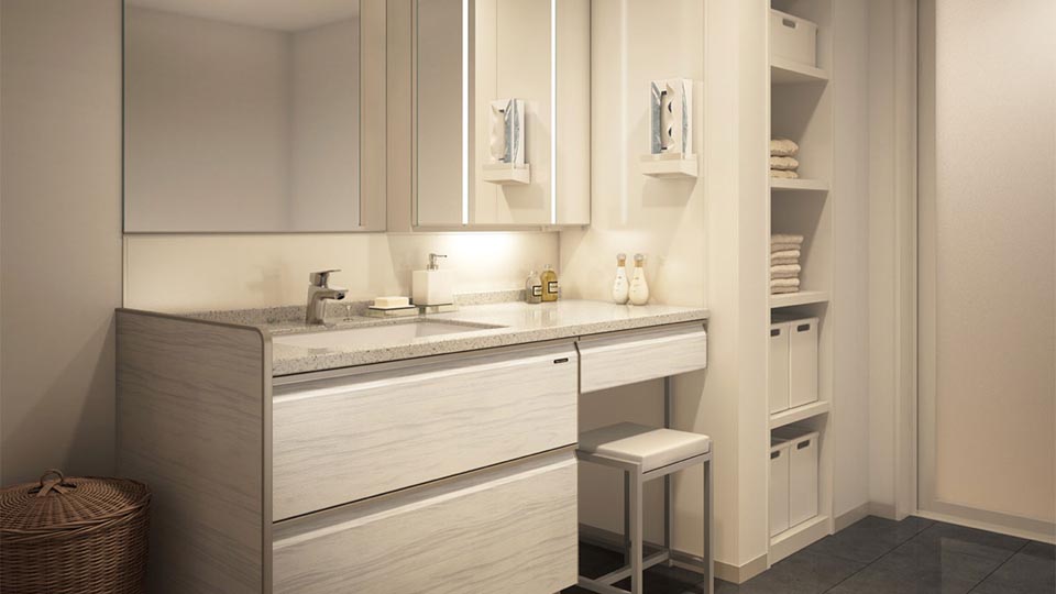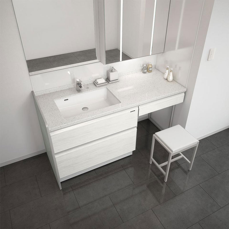 ゆったり座りながら、メイクやスキンケアを楽しめます。タオルや小物を置くことも。