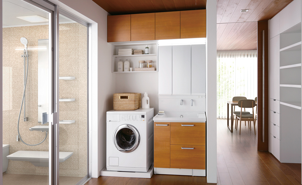 これまでデッドスペースだった排水管まわりが、たっぷりの収納スペースになります。